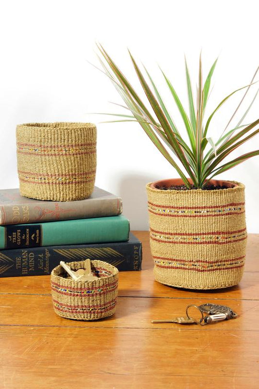Swahili African Modern Caramel Petite Set of Three Sisal Baskets with Colorful Beads